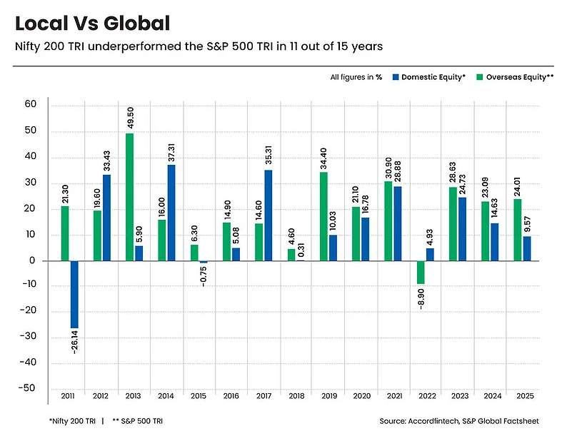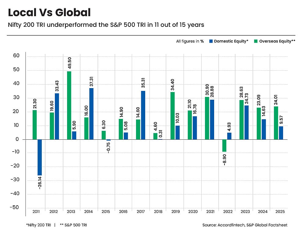 Over 2011-2025, data reveals a clear trend: the Nifty 200 TRI underperformed the S&P 500 TRI in 11 out of 15 years, often by a wide margin. For instance, Nifty 200 TRI delivered strong outperformance in select bull phases, notably in 2014 (37.31 per cent), 2017 (35.31 per cent), 2012 (33.43 per cent), and 2021 (28.88 per cent). On the other hand, S&P 500 TRI significantly outperformed in years other than these, including in 2013 (49.50 per cent versus 5.90 per cent from Nifty 200 TRI), 2019 (34.40 per cent vs 10.03 per cent), and 2011 when the overseas markets gained 21.30 per cent while domestic markets fell sharply by 26.14 per cent (see Local Vs Global).