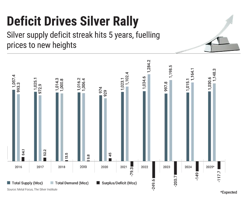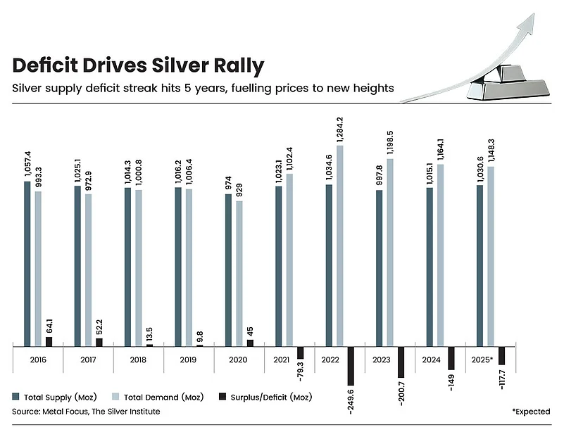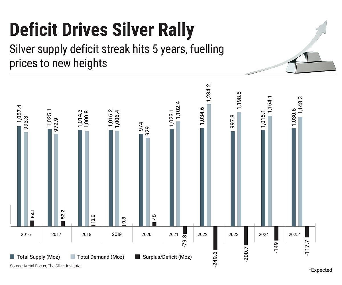 Demand-Supply Mismatch: At the core of the price surge in silver lies a persistent supply-demand imbalance. Global silver supply has failed to meet demand for five consecutive years, resulting in sustained market deficit. According to data from The Silver Institute, 2025 is the fifth consecutive year of a structural shortfall, due to constrained mine output and limited recycling. “This has created a price floor, which has resulted in upward pressure on silver valuations,” says Vikram Dhawan, head, commodities, and fund manager, Nippon India Mutual Fund.