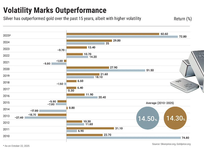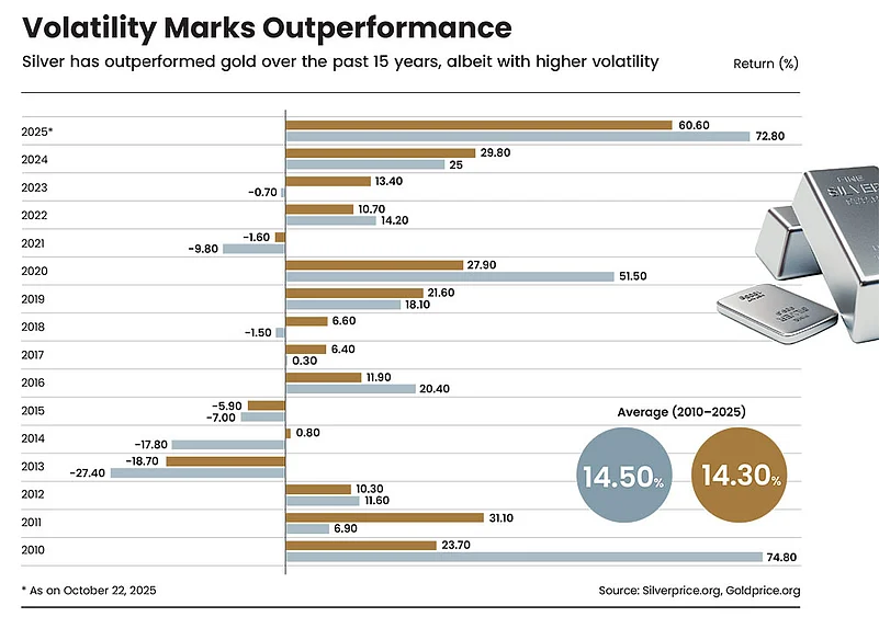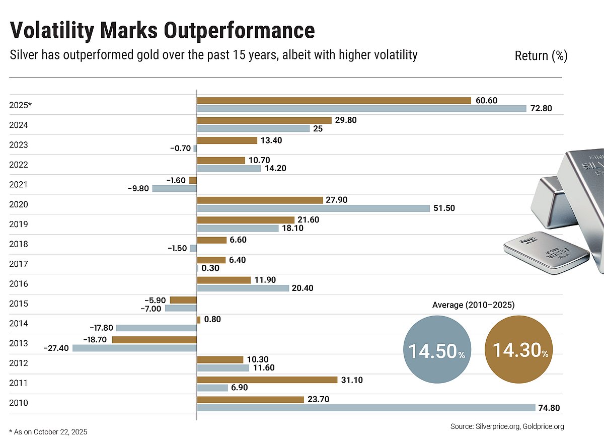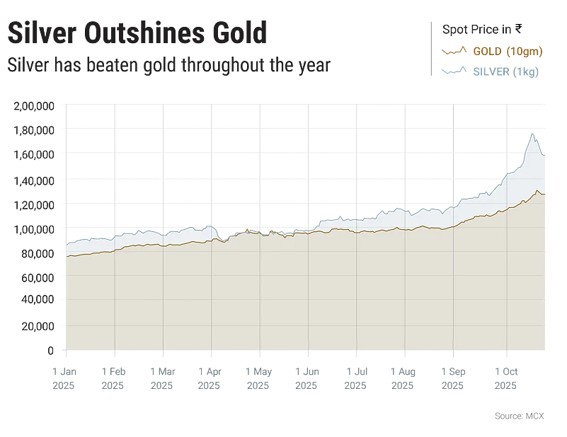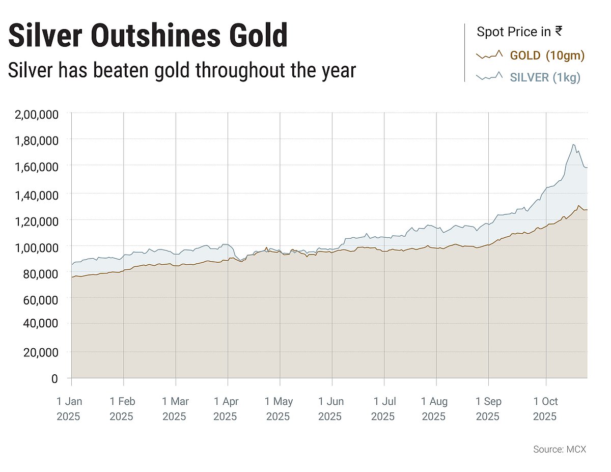 The white metal saw an extraordinary rally this year, with prices soaring to multi-year highs and breaking previous records. It breached its long-standing April 2011 high of $48.70 per ounce to reach $54.08 per ounce on October 17, 2025, in the international market. In the domestic spot market, it reached a new high of Rs 1,76,304 on October 14, 2025. In fact, October 2025 will go down as a landmark month for silver as it not only touched a new all-time high, but also gave the highest-ever monthly return.