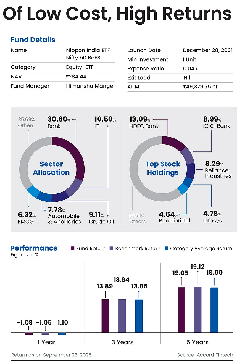 If you want to stay away from the constant game of chasing outperformance or worrying about underperformance, exchange-traded funds (ETFs) can be a smart option. They provide broad market exposure, are cost-efficient, and eliminate the need to time the market. An index ETF allows you to invest in sectors and stocks of the underlying benchmark in the same proportion as the benchmark. If you want to invest in Nifty 50 companies, Nippon India Nifty 50 BeES could be a decent choice.