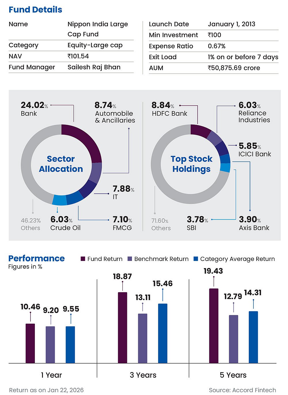If you are exploring large-cap funds to start your equity investment journey or to diversify your portfolio, Nippon India Large Cap Fund could be worth considering, given its long-term track record. The consistency of its management team is also noteworthy. Its fund manager, Sailesh Raj Bhan, has been at the helm since 2007, providing stability to the fund’s investment philosophy, stock selection, and risk management during volatile phases.
