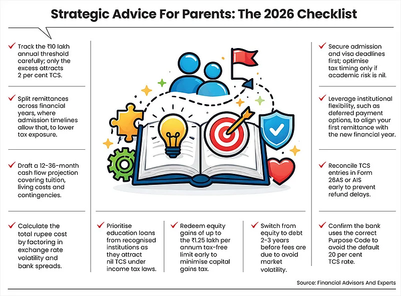 But it is important to track the annual threshold and plan the timing of transfers carefully to calculate the benefit. Dishit Parekh, chartered accountant (CA), certified financial planner (CFP), and founder of Foresight Financial Advisory, a mutual fund distributing firm based in Ahmedabad, says, “If tuition and living expenses are close to Rs 10 lakh, families may consider splitting remittances across financial years where timelines allow, in order to reduce exposure to TCS.”