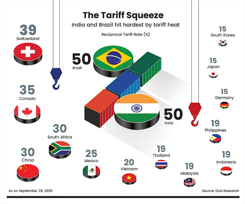 Says Aditi Nayar, chief economist and head-research and outreach at ICRA, a credit rating agency: “Textiles and apparel, where the US accounts for a third of Indian exports, are among the hardest hit, as switching between suppliers isn’t too difficult. The sector’s initial resilience—thanks to advance orders and the ability to pass on the first 25 per cent tariff—has given way to concerns about the additional penalty.”
