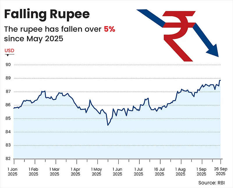 The Indian rupee has also been impacted. It has fallen over 5 per cent since May 2025 (see Falling Rupee). This has worked like a double-edged sword. Typically, a weaker rupee benefits export-oriented sectors, as they earn in dollars. But this time, due to the tariff shock, the order books of export-driven industries have already taken a hit, limiting the currency advantage. At the same time, a weaker rupee also makes imports costlier, which has added pressure on the economy.