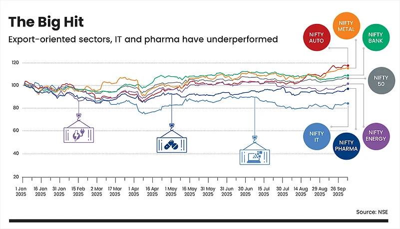 Then, the GST booster brought back confidence. However, the steep hike in H-1B visa fees later in the month turned market sentiment sour and put it on a slippery track. Since then, the market has been on a downward spiral. The pharma tariff seems to have added to the negative sentiment. Both the Sensex and Nifty fell around 1 per cent, while export-oriented sector indices Nifty IT and Nifty Pharma fell 2.45 per cent and 2.14 per cent, respectively. The sectors are among the worst performers this calendar year, IT dipping 22.30 and pharma 8.32 per cent year-to-date (YTD) as on September 26.