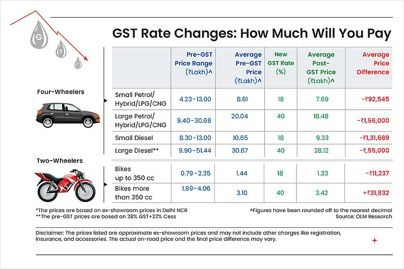 Some of the most sold cars in this category include Alto K10, Swift, and WagonR from the Maruti Suzuki stable; Altroz and Punch from Tata Motors, and Hyundai i20. The prices for such cars typically ranged between Rs 4.23 lakh and Rs 13 lakh (ex-showroom, Delhi), prior to the changes in GST slabs. While the price ultimately depends on the trim of the car selected, the average price for vehicles in this category was around Rs 8.61 lakh. Following the reduction in GST rates, the average price in this category has reduced by an average Rs 92,545, according to calculations based on existing and revised GST rates (see GST Rate Changes: How Much Will You Pay?). Prices are likely to reduce by Rs 45,000 for entry-level cars and by nearly Rs 1.31 lakh for the higher-end models.