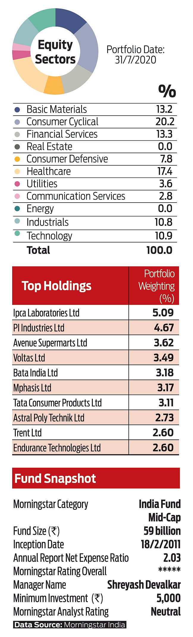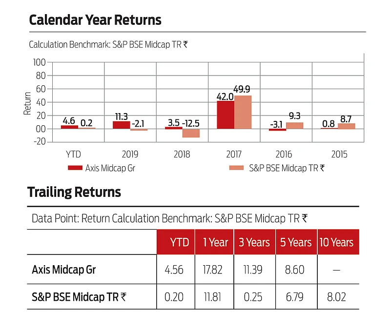 The Axis Mid Cap fund stands out on many counts. The portfolio manager’s ability to execute the strategy in a consistent manner has yielded positive results. Shreyas Devalkar has been associated with the AMC since 2016 and has been managing the Axis Midcap Fund since November 2016. Devalkar’s experience of working as a credit analyst, sell-side broking analyst, and equity analyst covering multiple sectors is a positive.