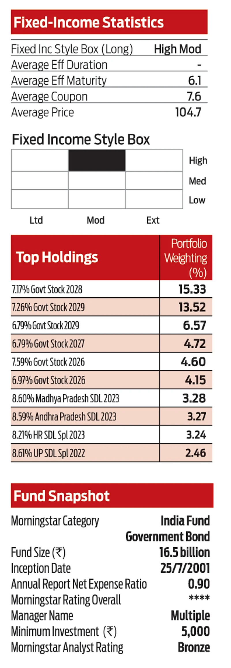 The investment approach centres on building the portfolio by having government securities issued by the central government. Bamboli does not shy away from taking relatively small exposure in state development loans if they are trading at attractive yields.