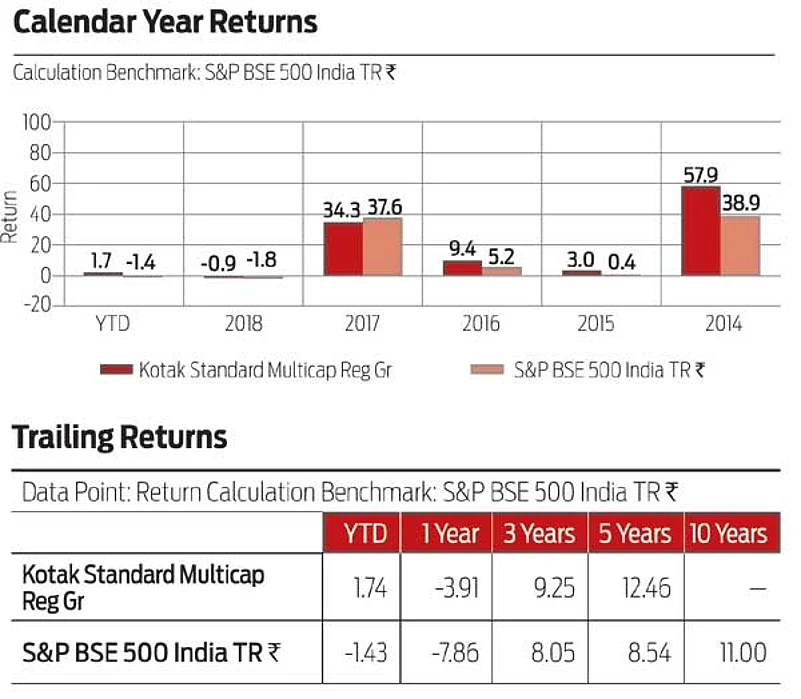 The Kotak Standard Multicap Fund was known as the Select Focus Fund prior to SEBI’s categorisation and is currently the largest fund in its category. The fund has been managed by Harsha Upadhyaya since 2012 and has been run with a predominant focus on large-cap companies.