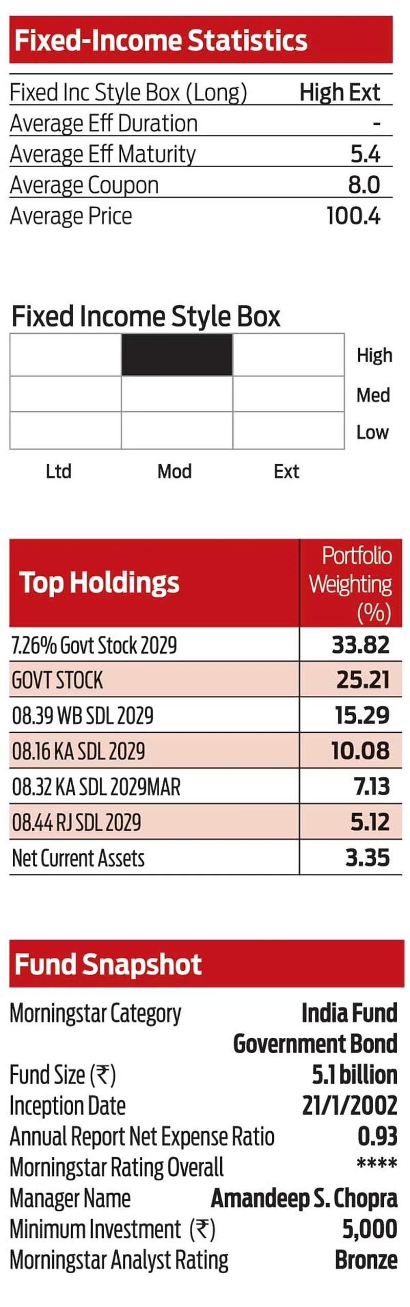 They track OMOs, trading volumes, broader market interest-rate directional views, and peer positioning actively. The average maturity can fluctuate significantly and is positioned in line with Amandeep Singh Chopra’s view of the interest rate environment. He can take significantly large positions in single papers, and we have witnessed high levels of concentration in the past. The process includes a lot of risk-management procedures both on the fund and the business side, and these seem to be followed in a stringent manner. The strategy typically consists of fewer than 10 holdings, and the execution is largely influenced by the team’s ability to take the right macro calls and position itself across yield curves.”