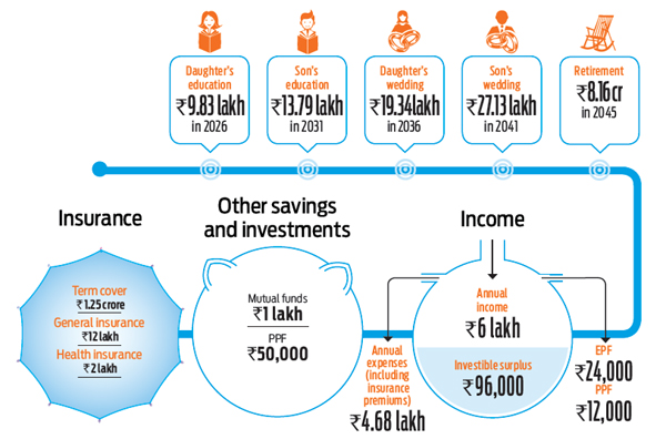For now, the family cannot fund the above requirements; hence the focus should be on increasing their disposable income. He should aim to close the personal loan at the earliest and divert the money towards retirement. He can also look to divert the annual bonus towards retirement savings. Last but not the least; a very important aspect of planning comprises of life insurance, health insurance, asset insurance and contingency funds.