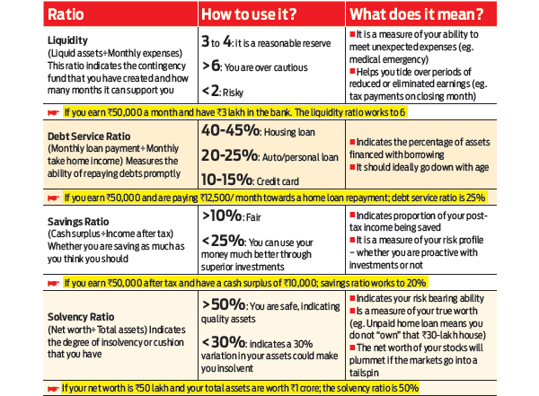 Often, the first real financial lesson is learnt when you realise you have got too much debt with little or no means to pay it off. The three major issues that should concern you are: liquidity to meet emergencies, ability to meet long-term debt obligations such as the 15-year home loan that you have taken, or whether you are saving as much as you think you should. Also, it is important to realise the true worth of your holdings to judge your solvency. Here are some of the ratios that will help you get a fix on your financial status.