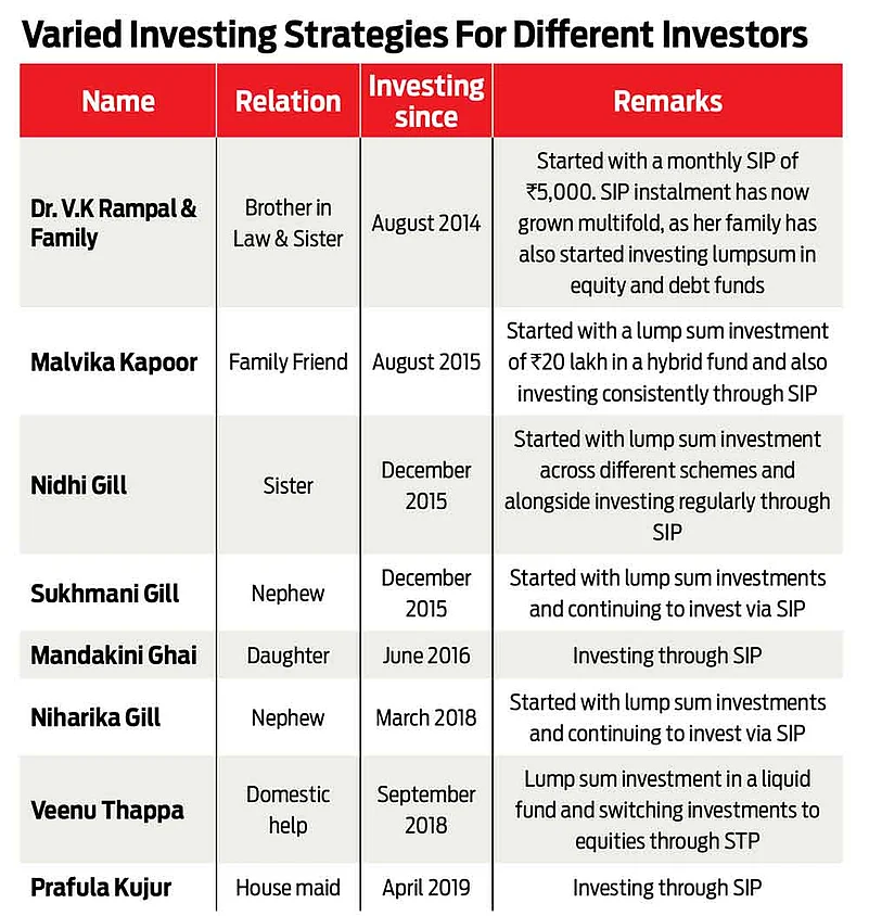 His trust towards mutual fund investing, further aided by his IFA’s guidance, has been instrumental in his family, relatives, and friends. However, there was no single investment strategy that could be adopted by all alike. Sandeep formulated suitable strategies for different people best suiting their financial goals, investment horizon, available investible funds, and risk appetite. While a few opted for lump sum investments, SIP mode found its place in almost all the investment plans. This was considered prudent, as SIPs required investment over time and not in one go and further mitigated the investment risk to some extent by investing across market movements. With a healthy accumulation and growth over the period, Sunil could also persuade his domestic help towards regular investing.