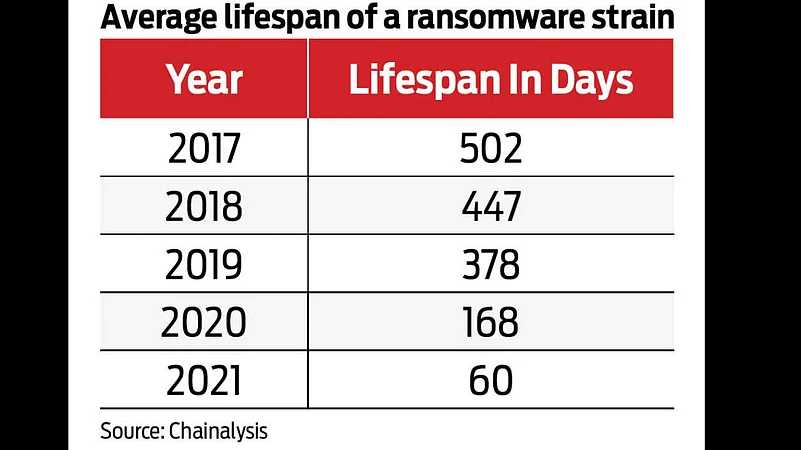 With a smaller ecosystem, the average lifespan of ransomware strains is also going down. While previously, in 2017, the average span of ransomware strains used to be more than 500 days, it plunged to 60 days in 2021.