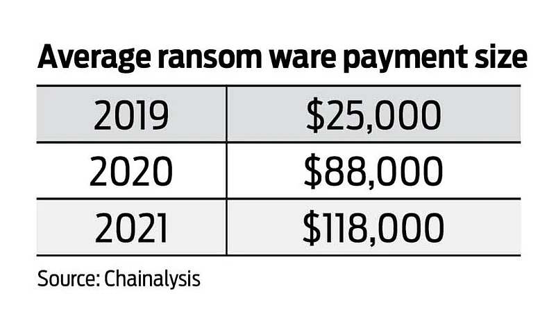 Ransomware activities have grown exponentially in 2021, with the average ransomware payment size in 2021 being five times the figure in 2019, finds a recent research report by Chainalysis, a blockchain data platform. The data shows that the average ransomware size grew from $25,000 in 2009 to $118,000 in 2021. The report mentions that ransomware activities through cryptos have been increasing since 2018.