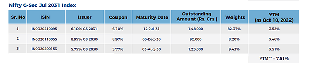 The fund will select the three most liquid G-Sec maturing in a 12-month period ending July 31, 2031. The selection will again be focused on the composite liquidity score based on the trades data available during the three-month period prior to June 15, 2022, with a minimum outstanding amount of Rs 25,000 crore as of June 15, 2022.