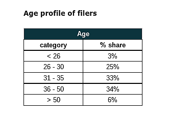 People below 26 years of age and those above 50 years of age comprised about 3 and 6 per cent respectively, in the demography representing people who were filing their ITRs.