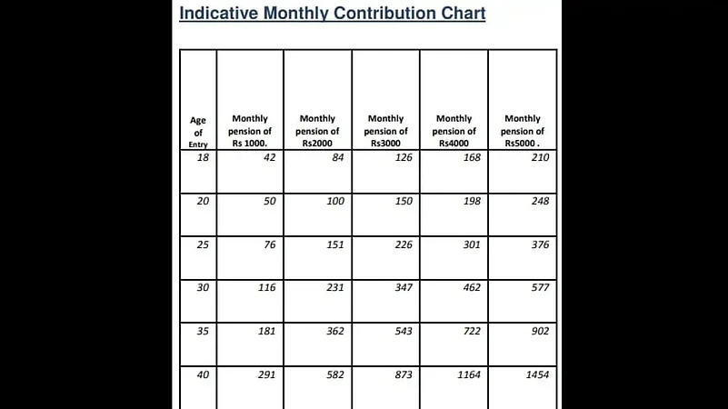 Suppose you are a 25-year-old and wish to get a pension of Rs 1,000 per month after you attain 60 years. For that, you will have to contribute Rs 76 per month. Likewise, if you want Rs 5,000 per month, then you will have to contribute Rs 376 per month (see table).