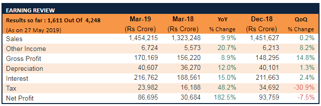 At this point a significant number of companies have already declared their Q4 (March’ 19) results and overall there is a positive change in both sales and net profit on an year over year basis, however on a sequential basis, both sales and net profits are stagnant and except for a few pockets of strength, there are no apparent signs of an uptick in earnings growth.