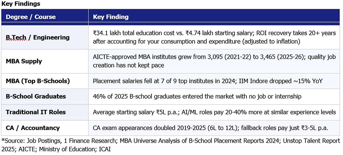 A recent research from the 1 Finance Global Economic Outlook 2026 has laid bare a troubling paradox at the heart of India's higher education system: the degrees families are sacrificing the most for - engineering, MBA, and professional qualifications - are barely delivering the promised returns. The research maps education costs against real salary outcomes across institutions and experience levels, finding that rising costs, oversupply of graduates, and a skills mismatch are quietly eroding the financial promise of a degree, even from the country's most prestigious institutes.