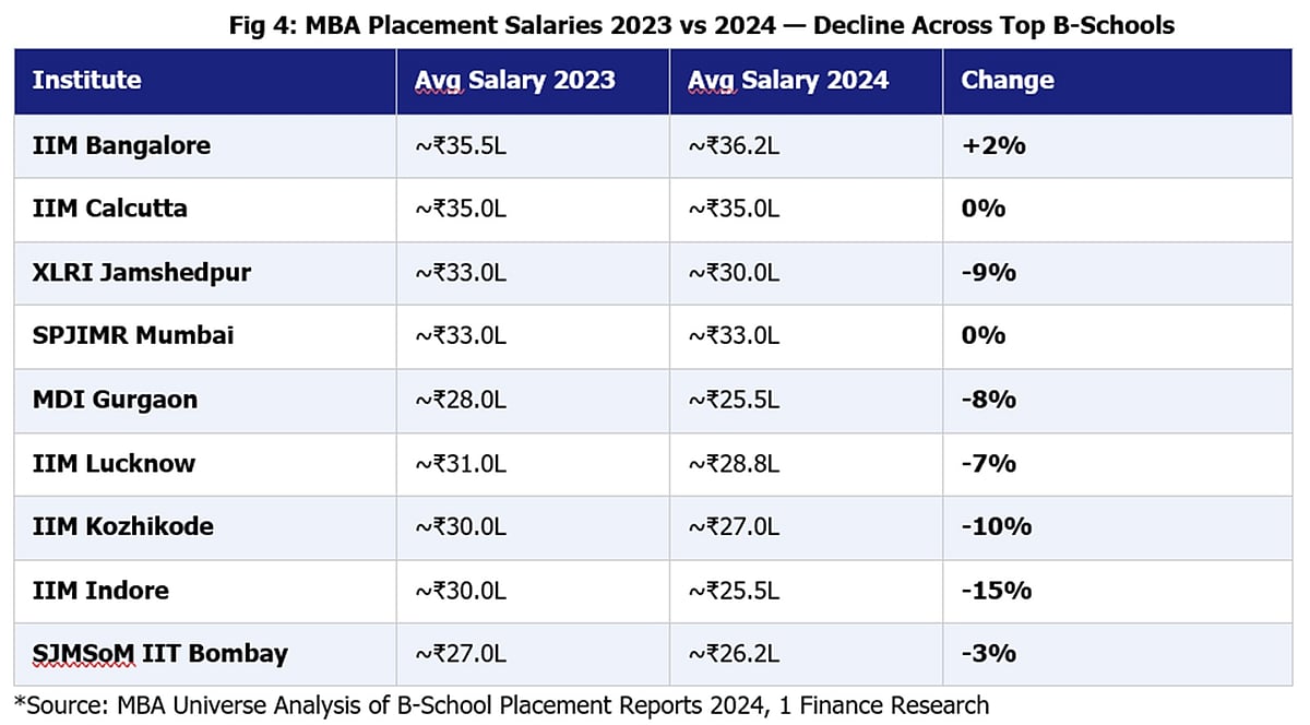 IIM Indore's average placement salary dropped nearly 15 per cent from 2023 to 2024, a dramatic decline for an institution that commands Rs 20-25 lakh in programme fees. Even IIM Bangalore and IIM Calcutta, which held steady, saw zero real wage growth after adjusting for inflation. The number of institutions is rising. Quality job creation is not.