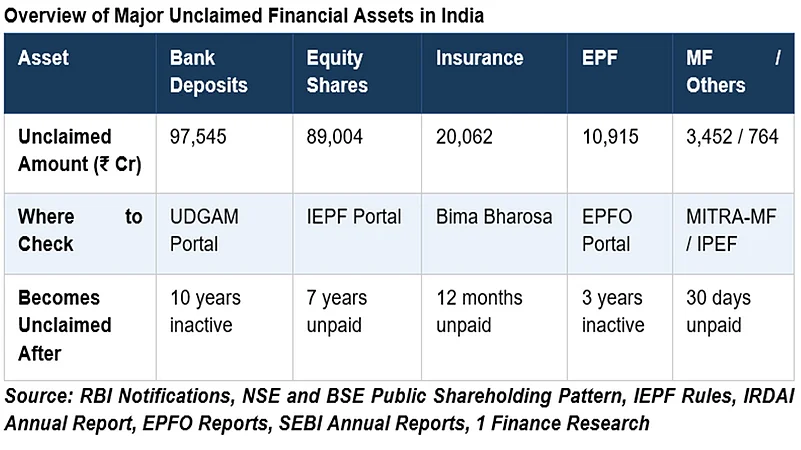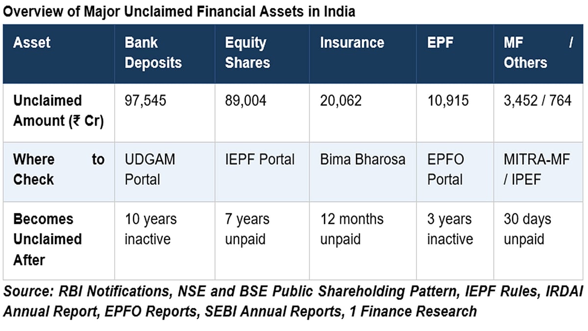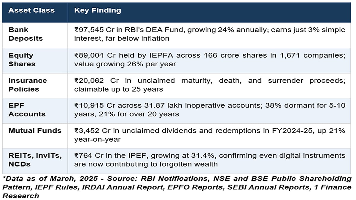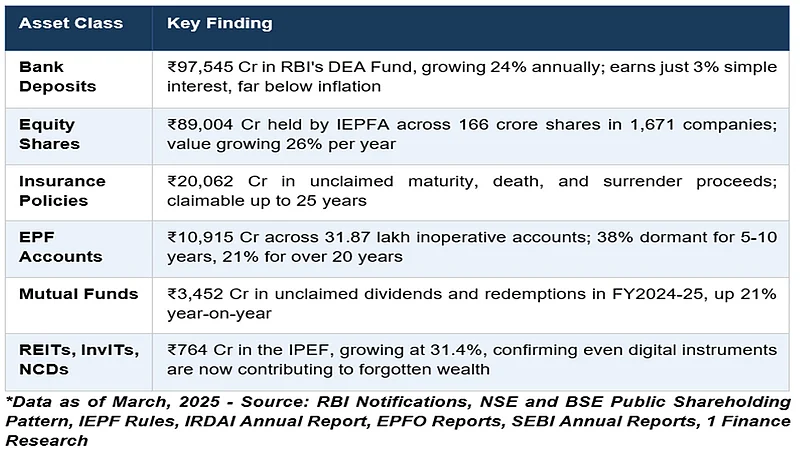 Animesh Hardia, Senior Vice President, Quantitative Research at 1 Finance, says, “What struck us most in this research is that India's unclaimed wealth problem hasn't shrunk with digitalisation, it has actually expanded into new asset classes. We mapped over two lakh crores across six categories, from decades-old bank deposits to distributions from REITs and InvITs that are barely a few years old. The infrastructure to invest has outpaced the infrastructure to ensure that wealth reaches the people it belongs to.”