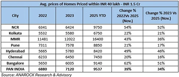 Delhi-NCR led the price surge, recording a sharp 23 per cent year-on-year increase, with average residential prices climbing from Rs 7,550 per sq ft in 2024 to close to Rs 9,300 per sq ft in 2025. In contrast, other major cities saw more moderate, single-digit price growth of 4–9 per cent in 2025, a significant deceleration from the 13–27 per cent appreciation recorded in 2024.