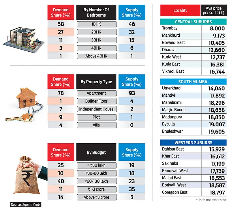 The Mumbai residential market’s strong demand momentum continued in the fourth quarter (Q4) of 2022, in line with the previous quarters. Central suburbs dominated the supply of new residential units, followed by Western suburbs. However, like the earlier quarters, demand for larger configurations dipped, as 3BHK and above configurations comprised only 15 per cent of the total online searches. Smaller units like 1BHK and 2BHK saw similar demand as in the last quarter. The requirement for 2BHK stood at 27 per cent of the total searches. The supply, on the other hand, was also in sync with the demand trends, with 1BHK units registering a 46 per cent share of the inventory, followed by 2BHK. Price-wise, properties worth less than Rs 30 lakh saw a slight decline compared to Q3, 2022, while units worth Rs 60-100 lakh stood at 40 per cent, and units worth Rs 1 crore and above comprised about 40 per cent of the inventory.
