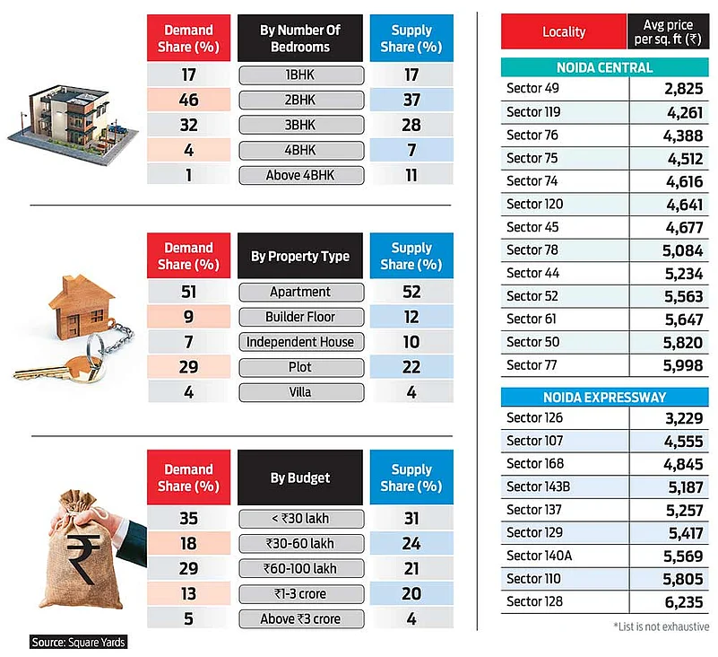 Noida’s housing market promises strong returns for investors due to its robust connectivity, affordability, and great infrastructure. Echoing upbeat demand in the fourth quarter (Q4) of 2022, Noida’s mid-segment houses ruled online searches in Q1 2023. About 47 per cent of the total online search was for properties worth Rs 30 lakh-100 lakh, with the upper mid-segment (Rs 60 lakh-100 lakh) taking the lead, holding over one-third of the demand share. Properties below Rs 30 lakh also saw a surge, comprising nearly 35 per cent of the demand, mainly by first-time homebuyers. However, only the Greater Noida region saw new launches. 2BHK units remain the most sought-after with 46 per cent of the total demand. Demand for 3BHK and bigger formats grew from the previous quarter with a 32 per cent share. Apartments saw over 50 per cent of search trends, an increase from Q4 2022.