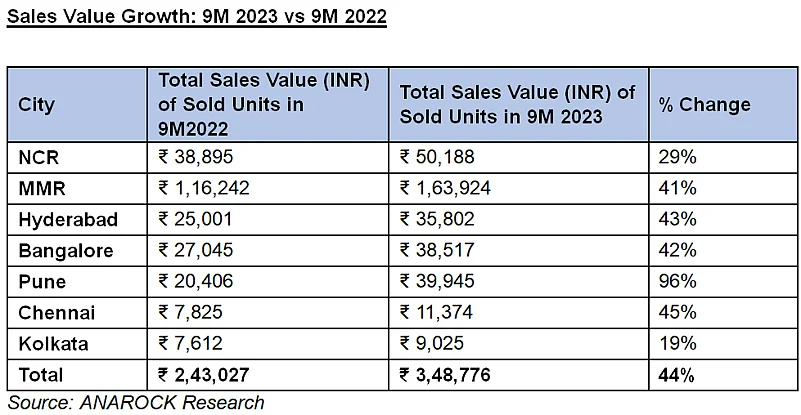 "The fact that the housing sales value in 9M 2023 exceeded that of the entire 2022 reflects the increased demand for premium luxury homes this year," Anuj Puri, Chairman of ANAROCK Group, said. "This makes it difficult to compare annual sales values apples to apples, especially since the top cities' average prices increased by 8–18% this year," Puri added.