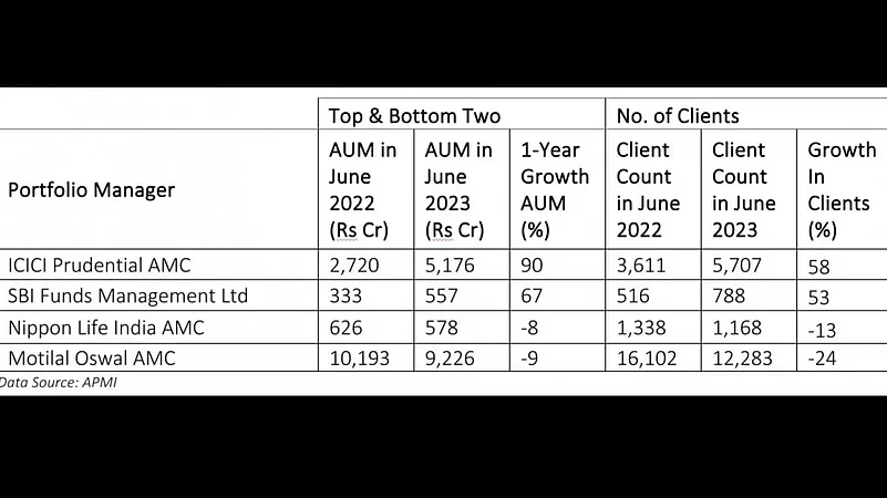 Among the mutual fund players, the fastest growing player in the PMS segment was ICICI Prudential AMC, which registered an impressive 90 per cent growth in PMS AUM. This was at a time when names like Invesco Asset Management (India), Nippon Life India Asset Management and Motilal Oswal AMC registered de-growth in their assets.