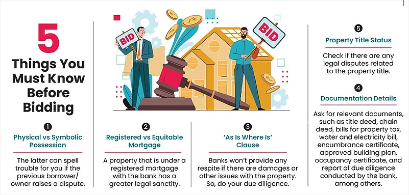 Usually, banks auction a property after the title is legally transferred to them, but the problem arises at the time of possession. Says Ameet Hariani, senior solicitor, arbitrator and mediator, Bombay High Court: “Buying a property auctioned under the Sarfaesi Act, 2002 can be safe, as the bank has already established its legal ownership. However, buyers must conduct due diligence on the property’s title and any outstanding dues. The key is to get free, complete and clear ownership and possession with no hidden surprises.”