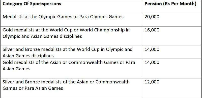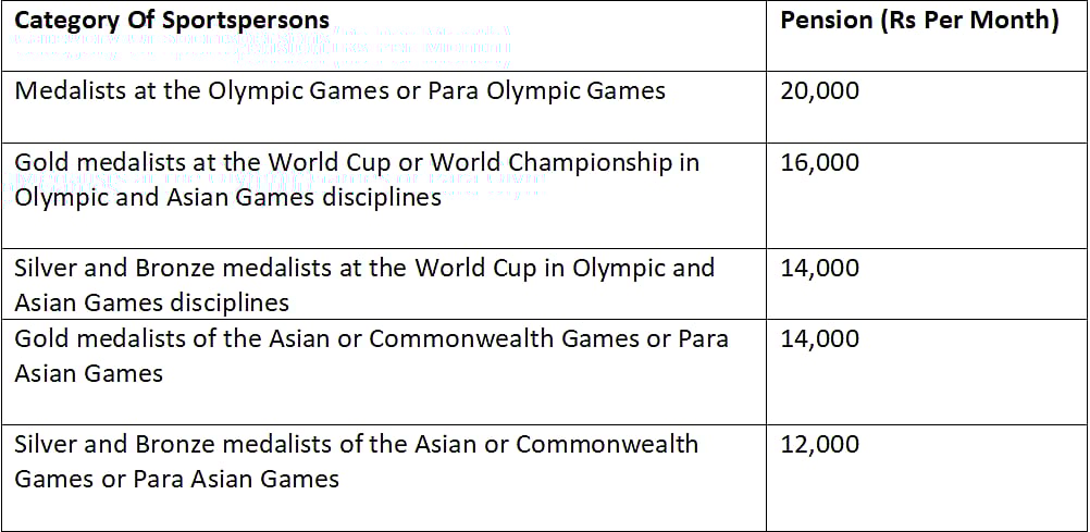 Olympic and Para Olympic medalists get the highest Rs 20,000 monthly pension.