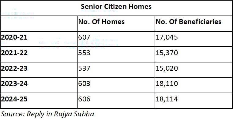 Per the data, the highest number of senior citizens’ homes is in Odisha (82), followed by Andhra Pradesh (74) and Tamil Nadu (70). However, the top states with the maximum number of beneficiaries in 2024-25 were Maharashtra (2,135), Odisha (2,125), and Tamil Nadu (1,950).