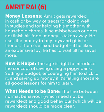 Amrit’s ‘good behaviour’ includes helping his mother tidy up the house, completing his homework and doing lessons by himself, or at times just behaving himself in public. Money is deducted if Amrit misbehaves – for instance, if he doesn’t finish his food or refuses to obey his mother. It is to build a sense of independence in Amrit that his mother Anuradha Rai started rewarding him for good behaviour. And taking away money is to let him know that it’s the result of his bad behaviour. “I reward him when he does things on his own without our prompting. This encourages him to do things better than he normally does. He knows that only then will he get rewarded. I’m building up his expectations, but he should realise that this is how it will be when he grows up. He should do work exceptionally well in order to get rewarded,” says Rai.