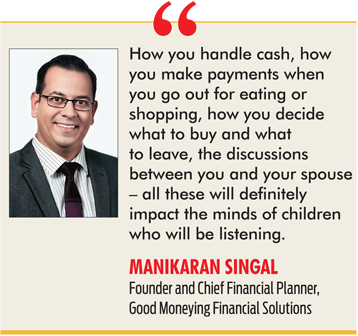 According to Manikaran Singal, founder and Chief Financial Planner at Good Moneying Financial Solutions, children learn by observation and imitation. So parents need to be careful how they behave with money. “How you handle cash, how you make payments when you go out for eating or shopping, how you decide what to buy and what to leave, the discussions between you and your spouse – all these will definitely impact the minds of children who will be listening. They will indirectly imbibe that in their own money behaviour,” he says.