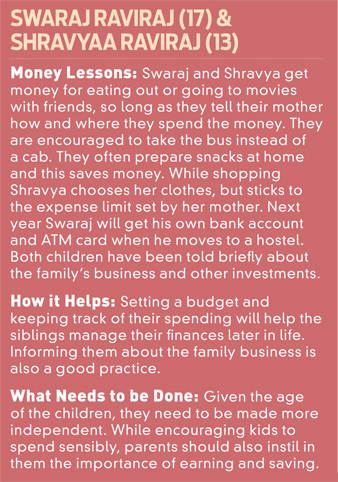 Mini Raviraj’s biggest concern about giving money to her kids is that they may misuse it. “I don’t want them to be influenced by their peers and overspend. That’s why I haven’t given them an ATM card yet. But next year when Swaraj shifts to hostel I shall open an account and put a limited amount in it for his use,” she says.