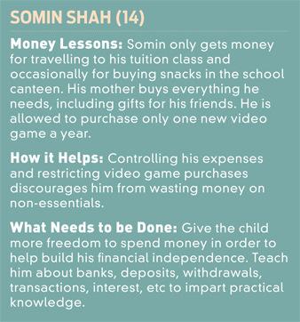 A disciplined and frugal lifestyle is a good way to teach children the value of money, but it’s possible to overdo it. This kind of behaviour will not help build financial independence. Fourteen-year-old Somin Shah loves to play video games, but his mother Poonam Shah permits him to buy only one new game a year – that too, costing not more than `1000. He gets money only to go to his tuition classes or to eat in the school canteen occasionally. Other than that he gets no pocket money. The family restricts going to the movies and eating out to once a month. So far Somin has never gone to a bank by himself or operated his own bank account. But Shah plans to introduce him to banking soon and teach him how to use an ATM.