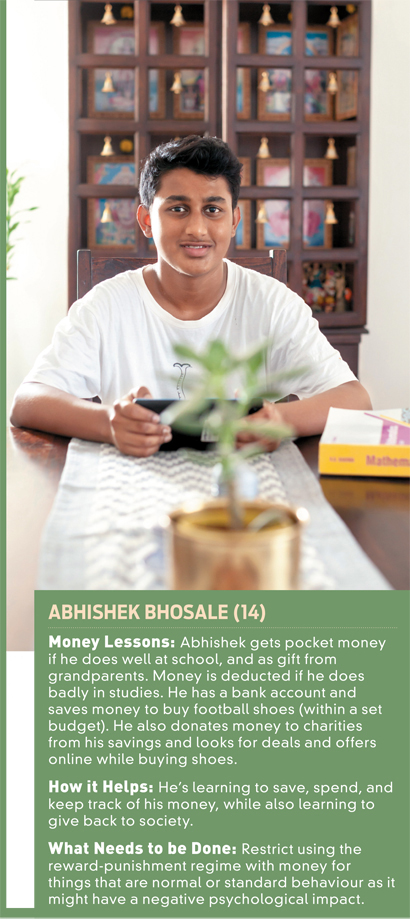 Just like Amrit saves money in his special box, 14-year-old Abhishek Bhosale used to save money in his mother’s old purse till recently. While some parents are overgenerous with their children out of a sense of guilt, others go to the other extreme when it comes to saving and cutting back on treats. Abhishek’s mother shows him how much he’s earned for his good behaviour and what’s deducted for bad behaviour or for doing badly in school. Recently his parents opened a bank account for him. Now the money gets deposited in his account and Abhishek regularly checks the balance in his passbook. The family is saving for his higher education through mutual funds, and also encourages him to invest any extra money in his account in mutual funds. “By opening his account we wanted to show him how the value of money can increase when it is invested, which doesn’t happen when it’s kept at home,” says his mother Kalaivani Atul.