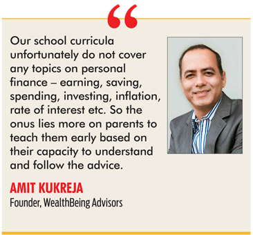 “They need not be involved in the household financial planning until they are at least 16. Our school curricula unfortunately do not cover any topics on personal finance – earning, saving, spending, investing, inflation, rate of interest etc. So the onus lies more on parents to teach them early based on their capacity to understand and follow the advice,” says Kukreja.