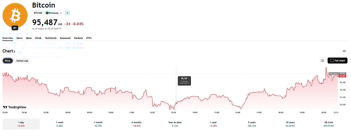 Bitcoin returned to the $95.5K area after the push toward $97K stalled, consistent with muted interest from everyday buyers. (Source: TradingView)
