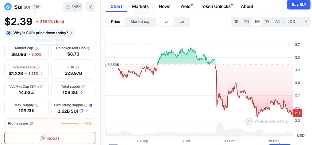 The SUI price might have been hit the hardest among the top altcoins. Amid rising selling pressure, it slid 10% on its weekly chart. Even more concerning is the 27% downturn over the past 30 days.