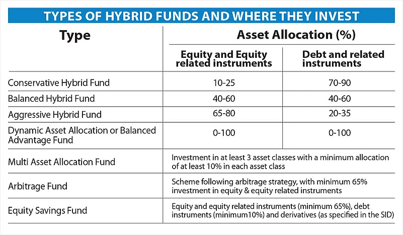 Take advantage of multiple asset classes Hybrid funds, as the name suggests, give you the best of the multiple worlds. They invest in multiple asset classes like equity, fixed income, silver and gold etc. While the equity component provides the power to earn market-linked returns, other asset classes like fixed income, silver and gold etc. provide stability as they are uncorrelated to equity market movements. Typically, in a bull run, hybrid funds may not appreciate as much as a pure equity funds, but in a bear phase, they don’t fall as much due to presence of other uncorrelated asset classes. Within the hybrid category, there are multiple options to choose from, depending on the mix of asset classes. Hybrid funds are predominantly of seven types Conservative Hybrid Fund, Balanced Hybrid Fund, Aggressive Hybrid Fund, Dynamic Asset Allocation or Balanced Advantage Fund, Multi Asset Allocation Fund, Arbitrage Fund, Equity Savings Fund depending upon the mix of assets and the way they are managed. Out of these seven, four of them are predominantly equity oriented fund such as Balanced Hybrid Fund, Aggressive Hybrid Fund, Arbitrage Fund and Equity Savings Fund depending on the equity allocation as they are mandated to take higher exposure in equity.
