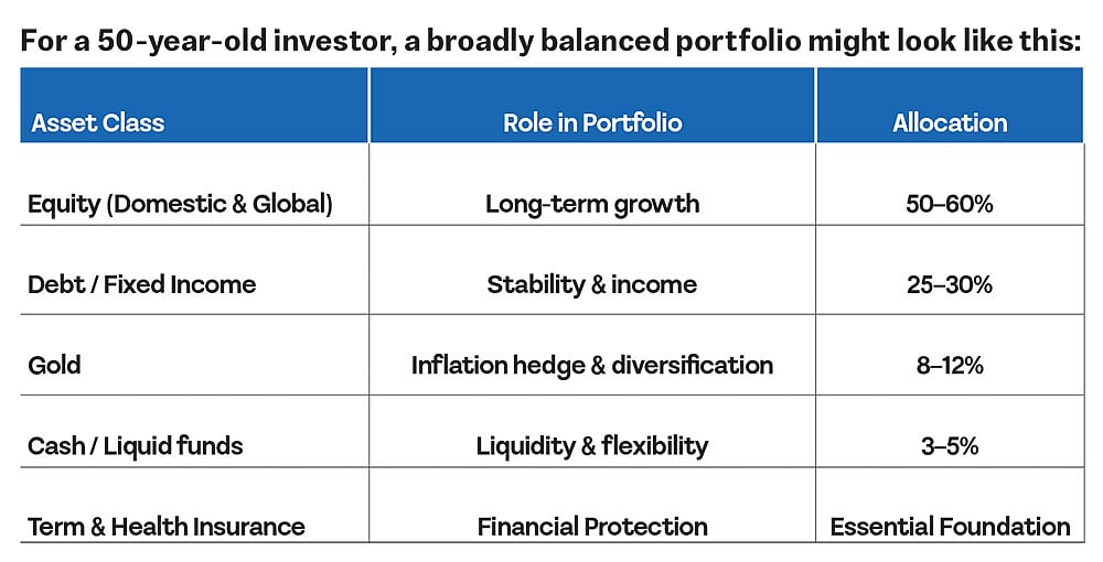 No single asset class wins in every market phase. Equities drive long-term growth but can fall sharply. Debt provides stability and income when equities struggle. Gold tends to hold its ground during inflation shocks and periods of stress. Cash preserves flexibility. Insurance, particularly term and health cover, protects everything else from being undone by an unexpected event. Together, these assets create a balance that is more durable than any single market call.