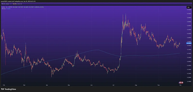 On the XLM chart, we can see the token is trading around $0.37, unable to build on the strong rally it had earlier in the summer when it briefly pushed above $0.50. Since then, the XLM price has been in a downtrend, losing momentum and breaking below key supports at $0.42 and $0.40.