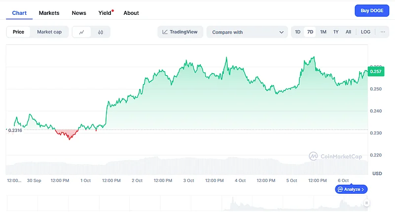 Over the past week, the Dogecoin price has gained about 7%, according to CoinMarketCap. This gain suggests growing interest from investors. The Dogecoin price is consolidating above $0.25 following a brief pullback from the $0.27 resistance.