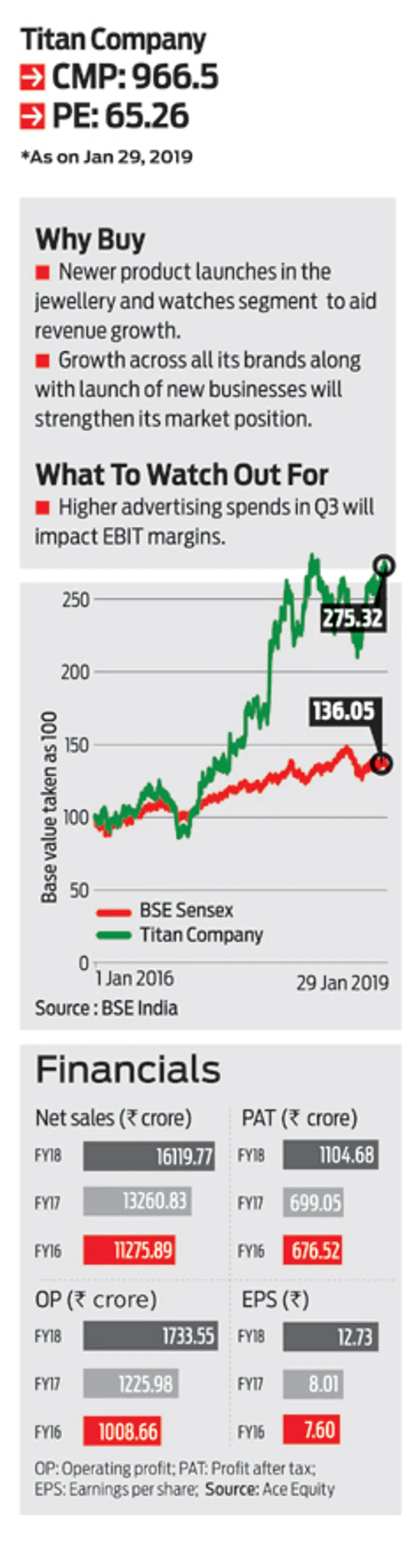 The company’s eyewear business has grown by 19 per cent in Q2 with introduction of more lower-price point products. Analysts at Prabhudas Lilladher observed, “Eyewear business has seen strong traction and is on track to achieve 3.7 million customers in FY2019 and five million in FY2020, benefits of backward integration and scale should enable profitable growth by FY2020.” Further, with the launch of many newer products across its brands-Titan, Fastrack and Sonata, the watch division posted a 17 per cent growth. However, the management warns investors about higher spends on advertising, which will hold back the EBIT margins in watches segment for the Q3.