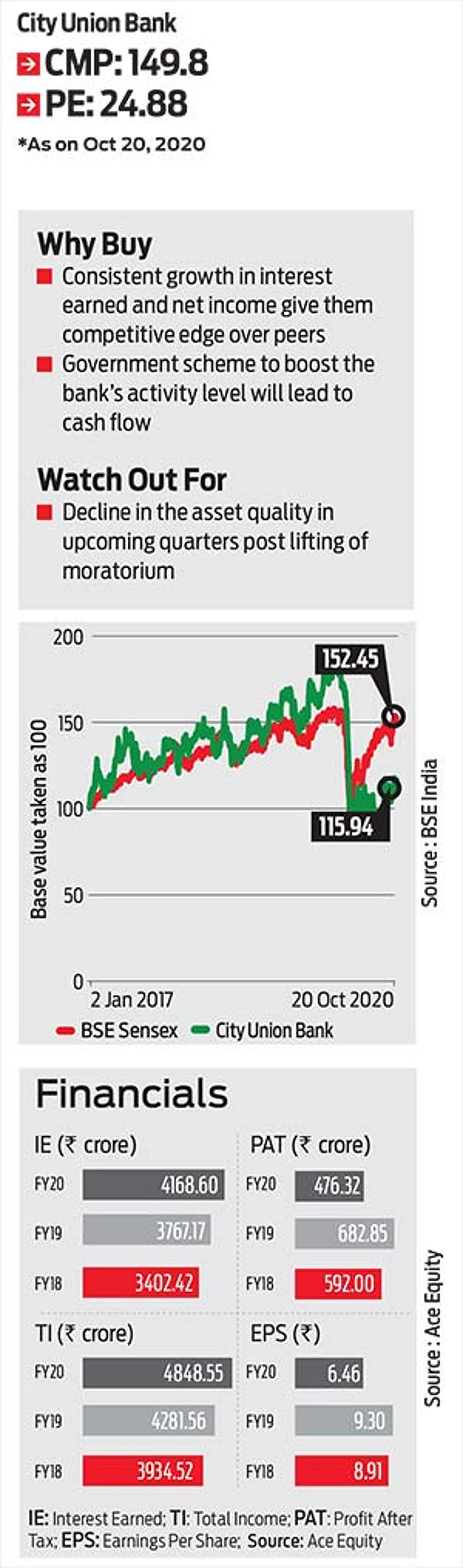 As of June 30, 2020, the bank’s loan book constituted MSMEs at 32 per cent, agriculture at 16 per cent and commercial trading at 13 per cent. CUB’s deposits and advances for the first quarter (Q1) of Financial Year (FY) 2021 saw a 5 per cent growth. Year-on-Year (Y-o-Y) growth was 7per cent. “We expect deposits and lending to grow at a CAGR of 7.7 per cent and 10.6 per cent respectively over FY21-22 estimates,” says an analyst at Geojit Financial Services.