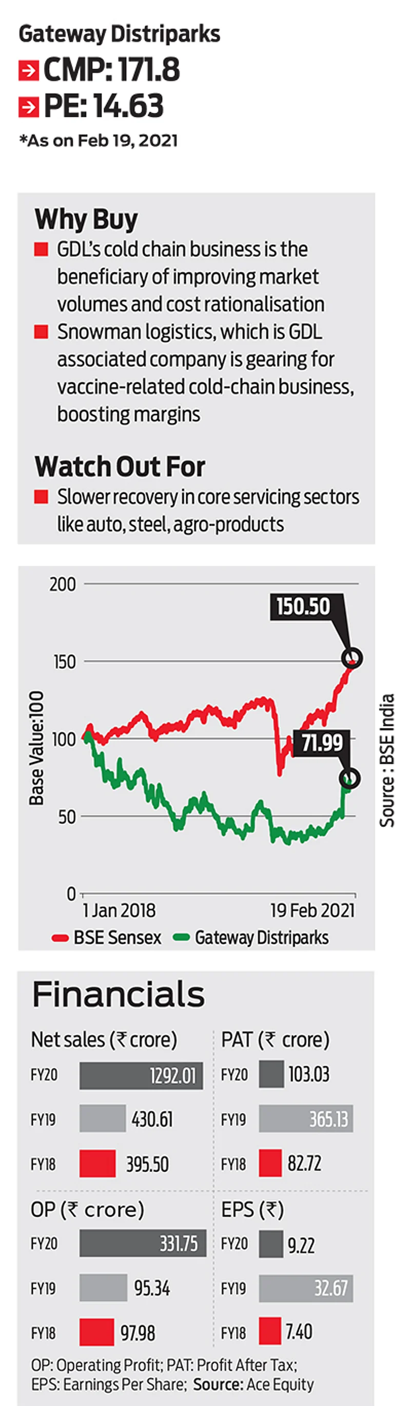 “We have revised EBITDA for the rail and CFS businesses by 5 per cent for 2023,” he adds. The company’s net debt as of December 31, 2020, stands at Rs 494 crore against Rs 681 crore on March 31, 2020. “GDL has been repaying its debt after the fundraising and, hence, the interest cost is down 33 per cent Y-o-Y,” explains an analyst at HDFC Securities. Its cold chain business has grown on the back of a recovery in market volumes and cost rationalisation. The business is planning to add 10,000 pellets and is in the process of developing a technology platform for integrating operations of its associate Snowman Logistics.