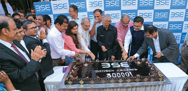 On April 26, the bellwether S&P BSE Sensex breached the 30,000 mark. The whole of April has witnessed frantic activity in the stock markets and many were waiting in anticipation of this momentous occasion. Celebrations at the BSE are evident with a giant cake and bonhomie among the market participants and the CEO, Ashish Chauhan. The last time the Sensex touched this mark was two years ago in March 2015 for a while, but could not hold on to it. This time around, market players and brokers feel there is scope to go up from here based on the improved economic indicators.